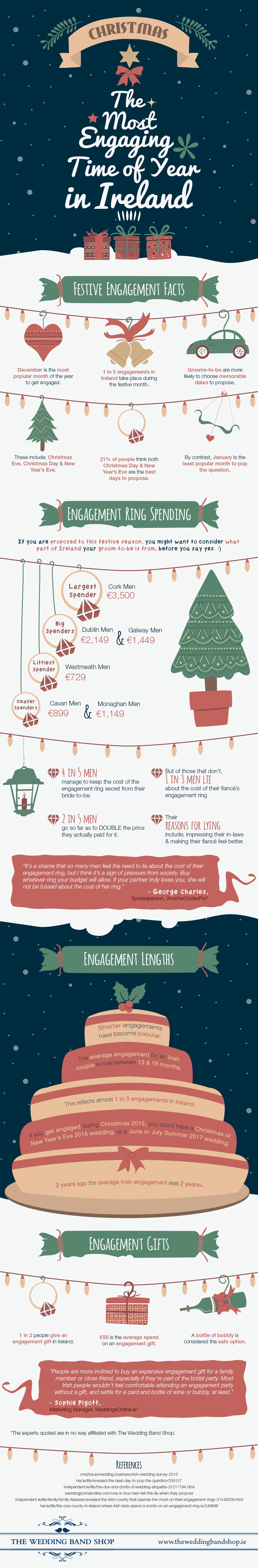 When it comes to the engagement ring, four in five men manage to keep the cost of the engagement ring secret from their bride-to-be, which is no mean feat. Of those grooms-to-be that do not manage to keep the cost a secret, unfortunately, one in three lie about the cost of their fiancé’s engagement ring. Cheekily, two in five grooms-to-be go so far as to double the price they actually paid for it. For more fascinating facts about wedding engagements in Ireland over the holiday period, have a look at this infographic produced by The Wedding Band Shop for more information.